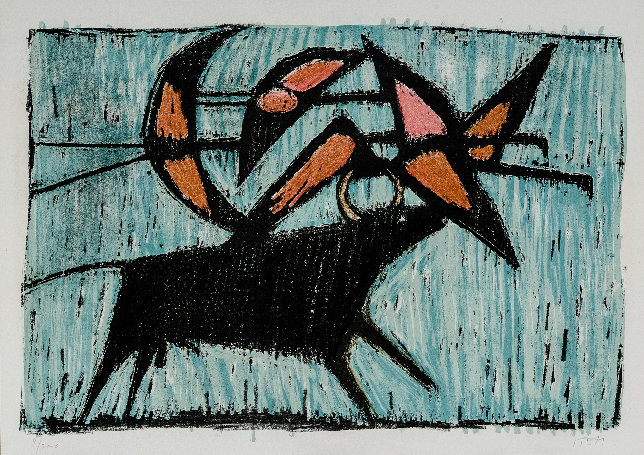 Flamants taureaux et soleil rouge, 1958, Lithographie sur , 63.5 x 90.5 cm (Cat. n° 5100)